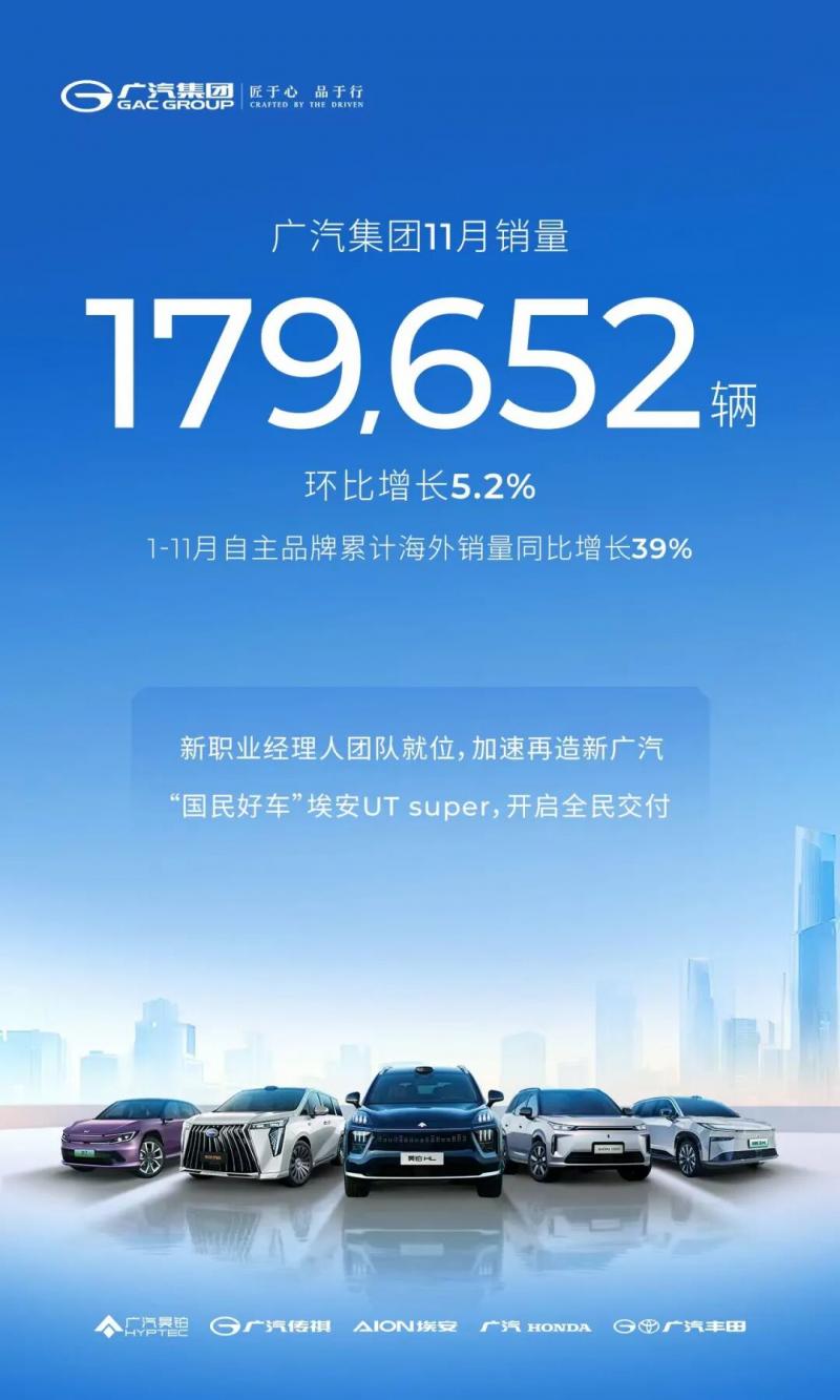 广汽集团11月汽车销量超17.97万辆,环比增长5.2%