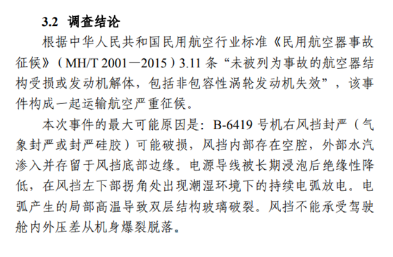 调查报告显示,本次事件的最大可能原因是:B-6419号机右风挡封严(气象封严或封严硅胶)可能破损,风挡内部存在空腔,外部水汽渗入并存留于风挡底部边缘。