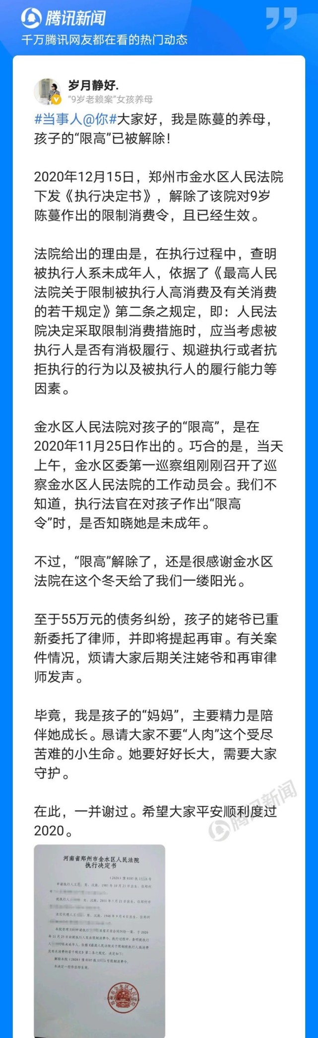 12月16日,郑州市金水区人民法院发布致歉声明称“我们错了!”声明中提到,对未成年人发出限制消费令不符合相关立法精神和善意文明执行理念,是错误的。法院已依法解除了限制消费令。郑州市金水区人民法院表示,儿童健康成长高于一切。该院个别执行人员机械司法,造成了很不好的社会影响,在今后工作中,他们将认真汲取教训,正确理解立法和司法解释精神,牢固树立审慎、善意、文明的执行理念,把保障未成年人健康成长放在最优先的位置,追求情、理、法相统一的司法目标,公平保护申请执行人和被执行人的合法权益。