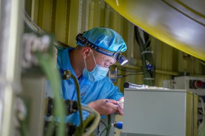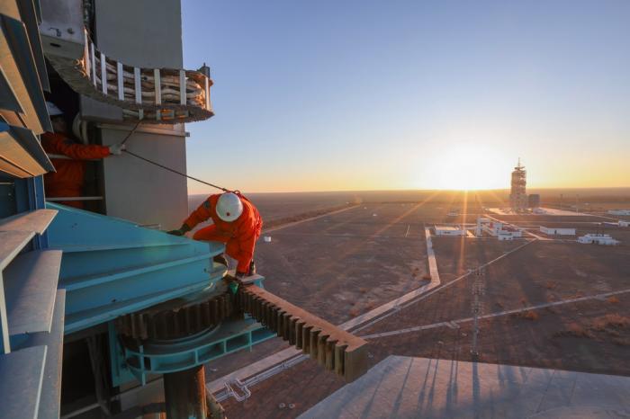 酒泉卫星发射中心平台工作人员更换回转平台齿轮油(12月24日摄)。作为我国组建最早的综合性航天发射中心,酒泉卫星发射中心有深厚的优良传统和红色基因。今年这个中心充分利用我国第一枚国产地地导弹“东风一号”发射60周年、第一颗人造卫星“东方红一号”发射50周年等重要节点,开展航天战旗接力传递、到发射阵地旧址参观见学等活动,激励广大科技人员以昂扬的斗志保障试验六号02星等顺利进入预定轨道。