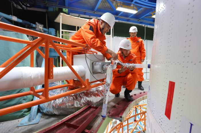 酒泉卫星发射中心工作人员对火箭进行状态确认(5月30日摄)。
