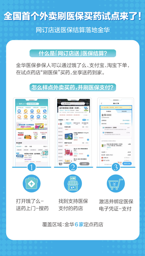 “‘网订店送’医保结算是金华市市民中心和支付宝、阿里健康、饿了么联合推出的便民服务之一,是在前期实行的浙江24小时网订店送的基础上结合国家医保电子凭证激活个账基金的一次创新便民服务。”金华市医保中心副主任吕警军说,“网订店送”医保结算已经在金华6家药房试点启用。