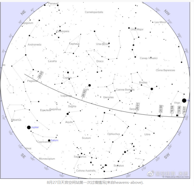 朱进表示,北京现在天气不错,“从我昨天晚上7点半前在雨后的云缝里面看到的天宫过境情况推断,今天晚上8点的这次过境会非常容易观测,大家不需要借助任何的观测设备,直接出门仰望星空就能轻松地看到一颗非常明亮的星星在晚上7点57分从西面低空正在下落的明亮的金星左侧升起,越来越高,8点01分接近正南方向地平高度60多度的位置,然后从天顶附近最亮的织女星和东南方向比较亮的牛郎星之间的连线中间穿过银河和著名的夏季大三角(8点02分),一直走到正东方向下落,在秋季星空的标志飞马四边形中间进入地球的影子突然消失。”