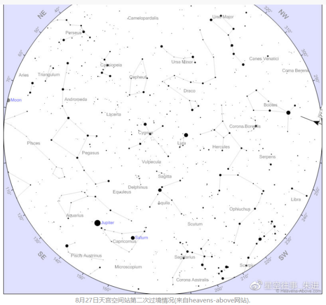 朱进介绍,从8月24号开始,对于北京地区和国内其他部分地区的观测者来说,中国空间站进入了每天傍晚可见过境的模式,预计会一直持续到9月7日。以北京天文馆的观测点(北京其他地方的过境情况应该基本一样)为例, 8月27日晚上,中国空间站有两次过境,其中第一次过境的观测条件非常好,空间站最高的时候在正南偏东一点儿地平高度达到70度,需要非常高的仰头才能看到。