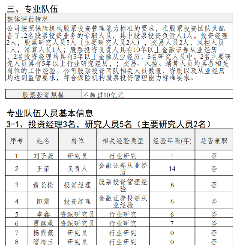 今年1月,弘康人寿发布《股票投资管理能力建设及自评估情况》,显示其股票投资团队共配备12名专职人员。其中,在5名股票研究人员团队中,有3位相关经验不超过1年。