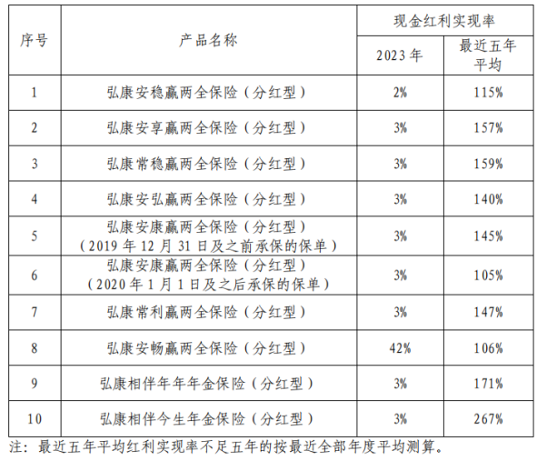 此外,曾经仰仗分红险“打天下”的弘康人寿如今风光不在。根据其2023年度分红型保险产品红利实现率的信息披露,弘康人寿多个产品的分红实现率下滑严重,最低跌至仅为2%。