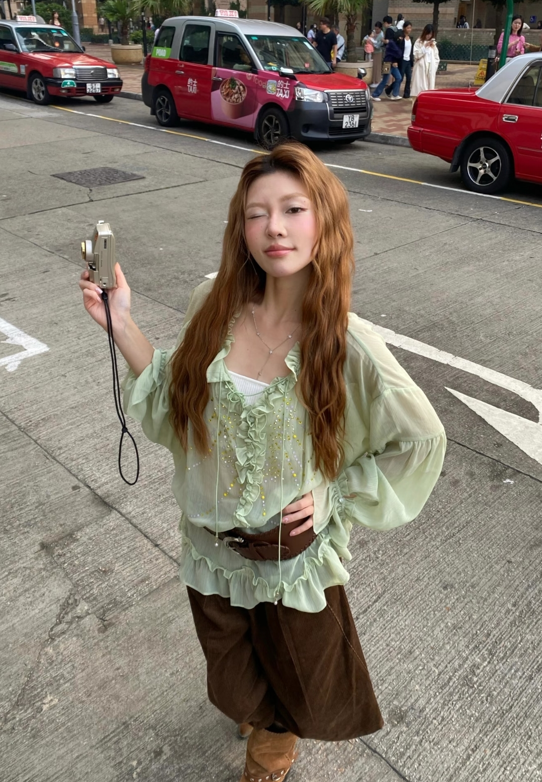 浅绿色上衣如森林晨雾,清新又充满生机,搭配沉稳的棕色裤靴,仿佛精灵从森林步入都市。低饱和绿与大地棕的组合,既有自然的治愈感,又暗藏复古奇幻氛围,完美契合精灵可露丽风 “甜酷交织,自带故事感” 的内核。