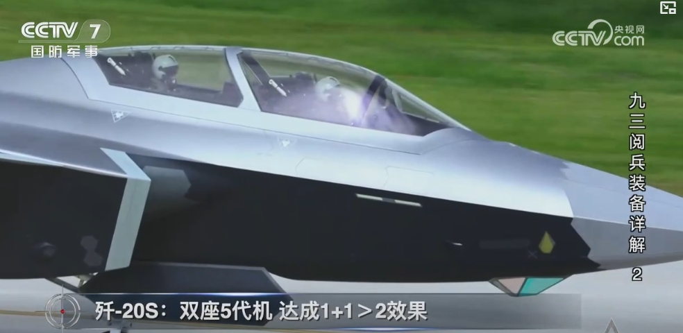 歼-20S系世界首款双座隐身战机。军事专家张学峰曾在央视栏目中解读受阅装备称,双座五代机可以达到“1+1>2”的效果。歼-20S增加了一个座位、一名飞行员,相当于在驾驶员基础上增加了一名任务规划官,使歼-20S可以发挥类似足球比赛中中场队员的作用,既可以前出得分,又可以串联、指挥其他队友。