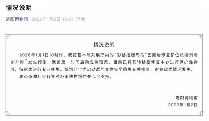 情况说明提到,2026年1月1日18时许,我馆基本陈列展厅内的“彩绘抬腿陶马”因原始修复部位粘接剂老化开裂发生倾倒,我馆第一时间启动应急预案,目前已将其转移至修复中心进行保护性存放,待后续进行专业修复。我馆已全面启动展厅文物安全隐患专项排查,避免此类情况发生。