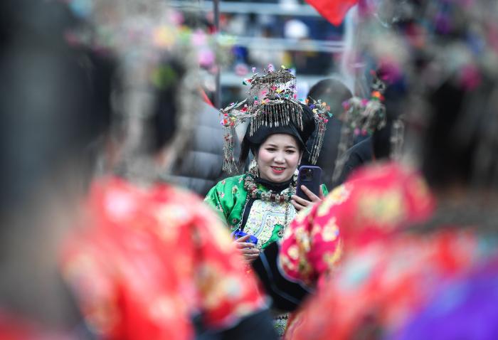 1月2日,侗族群众在第四届贵州“村超”开幕式现场整理头饰。