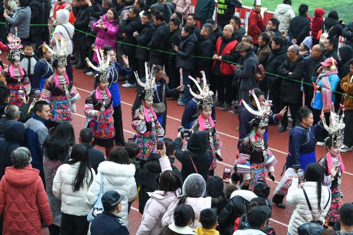 1月2日,侗族群众在第四届贵州“村超”开幕式现场。