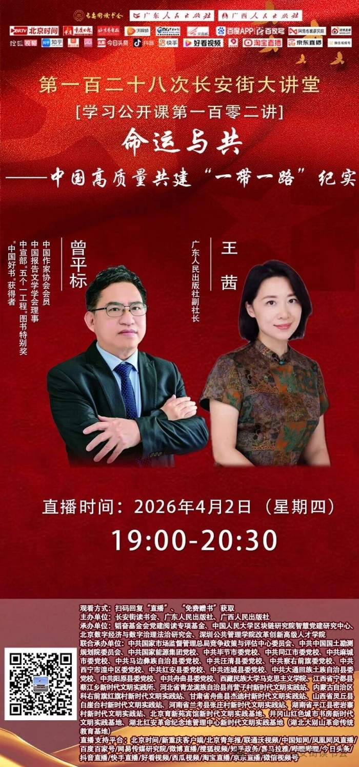 2026年4月2日19:00,长安街读书会联合广东人民出版社、广西人民出版社主办,韬奋基金会党建阅读专项基金、中国人民大学区块链研究院智慧党建研究中心、北京数字经济与数字治理法治研究会、深圳公共管理学院改革创新高级人才学院承办,中共国家市场监督管理总局竞争政策与评估中心委员会、中共中国国土勘测规划院委员会、中共国家能源集团党校、中共毕节市委党校、中共同江市委党校、中共麻城市委党校、中共马边彝族自治县委党校、中共汪清县委党校、中共察右前旗委党校、中共西宁市湟中区委党校、中共红安县委党校、中共连城县委党校、中共大通回族土族自治县委党校、中共阳原县委党校、中共舟曲县委党校、西藏民族大学马克思主义学院、江西省宁都县蔡江乡新时代文明实践所、河北省青龙满族自治县肖营子村新时代文明实践站、内蒙古自治区科右前旗红旗村新时代文明实践站、甘肃省舟曲县杰迪村新时代文明实践站、山西省灵丘县白崖台村新时代文明实践站、河南省兰考县张庄村新时代文明实践站、湖南省平江县密岩寨村新时代文明实践站、北京育新苑宾馆新时代文明实践基地、井冈山红色城市书房新时代文明实践基地、湖北红安革命纪念地管理中心新时代文明实践基地(湖北大别山革命传统教育基地)等单位联合承办的“命运与共——中国高质量共建“一带一路”纪实”之学习公开课第一百零二讲,在长安街读书会及其党建、中直、京直、干教、政法、企干、健康、地方、媒体、出版、博士团、英才中心等分会微信群,并在北京时间、新重庆客户端、北京青年报、联通沃视频、中国知网、凤凰网风视频、视频号等二十余家网络直播平台同时进行。