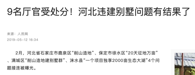 2019年2月,媒体对河北省石家庄市鹿泉区“削山造地”和保定市徐水区“20天征地万亩”、满城区“削山造地建别墅群”、涞水县“一个项目独享2000亩生态大湖”4个问题进行了报道。