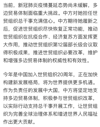 在当地时间15日世贸组织召开的线上总理事会特别会议上,中国常驻世贸组织代表团祝贺其当选。中国常驻世贸组织代表李成钢大使在总理事会上表示,世贸组织有了历史上第一位来自非洲的总干事,也是第一位女性总干事,这确实令人鼓舞。这一任命非常及时,世贸组织正处于关键时刻,必须能够尽快取得成果。