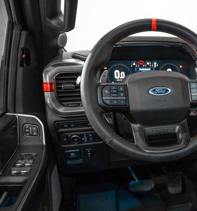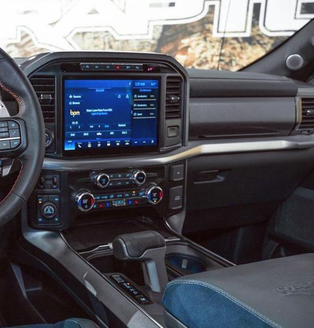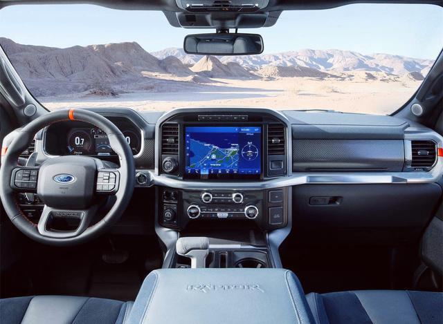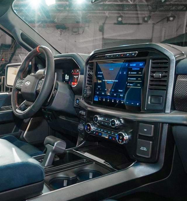 内饰方面,新一代F-150猛禽的中控同样是经典的野性、粗狂风格,细节上融入了一些时尚元素,例如12.3英寸的全液晶仪表,12英寸的中控触摸屏以及三幅式多功能方向盘和游艇一样的档把,进一步提升了车内的科技感。