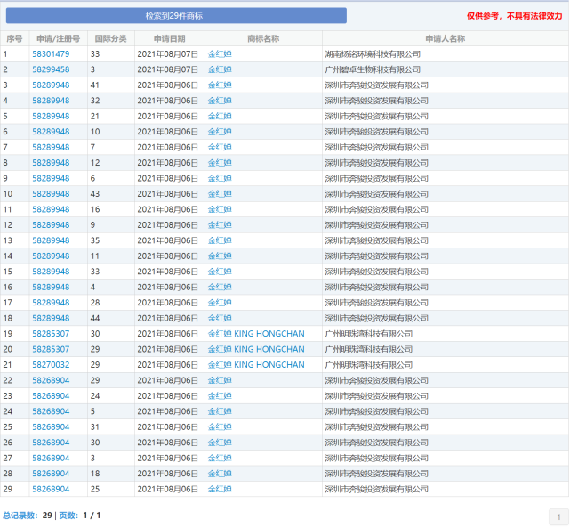 北青-北京头条记者在中国商标网搜索“金红婵”发现,相关商标有29个,均是8月6日及之后注册申请的,目前正等待受理。其中23个不同分类的“金红婵”商标申请人都是深圳市奔骏投资发展有限公司,至此,该公司已注册“全红婵”“金红婵”“红婵HCH”不同分类的商标共计39个。