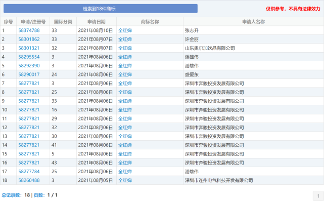 北青-北京头条记者查询中国商标网发现,8月5日,深圳市连州电气科技开发有限公司就申请了名为“全红婵”的商标,类别属于日化用品,目前仍在注册申请中。随后,又有其他个人及公司申请注册“全红婵”商标,类别涉及日化用品、医药、办公用品、服装鞋帽、布料床单、食品、啤酒饮料、酒、教育娱乐、餐饮住宿等,其中,仅深圳市奔骏投资发展有限公司就注册了10个不同分类的“全红婵”商标,潘世伟申请了3个不同分类的“全红婵”商标。