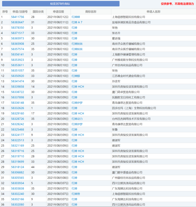 此外,北青-北京头条记者注意到,在中国商标网搜索“红婵”发现,相关商标有78个,包括“红婵”“红婵妹妹”“红婵HCH”“红婵馋”“红婵皇后QUEEN HONG CHAN”等,其中,72个是在今年8月5日之后注册申请的,目前正等待受理。注册6个不同分类“红婵HCH”商标的也是深圳市奔骏投资发展有限公司。