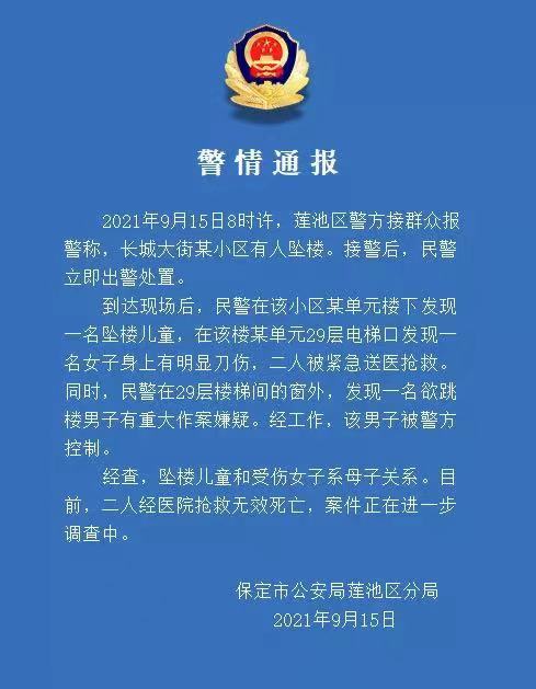 Qnews|保定一儿童坠楼死亡 其母受刀伤死亡 一男子有重大作案嫌疑被警方控制