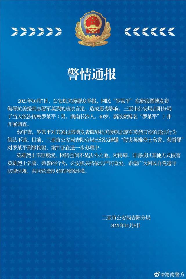近日,大v罗昌平疑似侮辱英烈被网友举报引发关注。据海南三亚市公安局吉阳分局10月8日通报,2021年10月7日,公安机关接群众举报,网民“罗某平”在新浪微博发布侮辱抗美援朝志愿军英烈的违法言论,造成恶劣影响。三亚市公安局吉阳分局于当天依法传唤罗某平(男,湖南长沙人,40岁,新浪微博名“罗某平”)并开展调查。