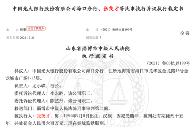 12月21日,中国裁判文书网发布了《中国光大银行股份有限公司海口分行、张茂才等民事执行异议执行裁定书》。
