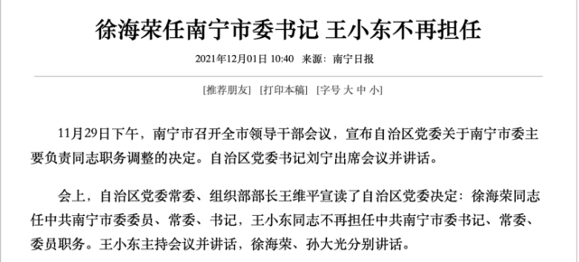 南宁市委书记换人。