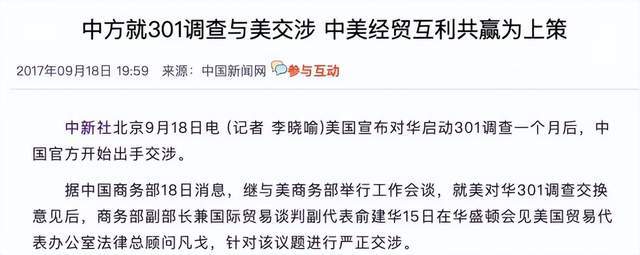 据中新社2017年报道,那是美国宣布对华启动301调查后,中美商务部首次举行工作会谈。