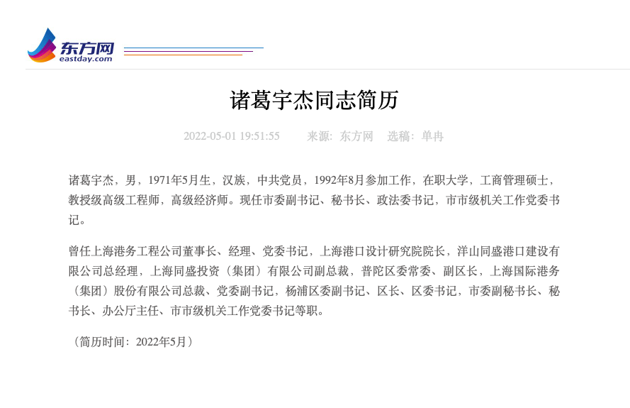 据东方网“诸葛宇杰同志简历”一栏最新信息显示,上海市委副书记、秘书长诸葛宇杰,已同时担任市委政法委书记。