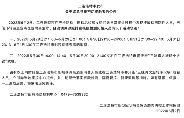 今年6月2日,二连浩特市发布紧急公告,称“6月2日,二连浩特市在应检尽检、愿检尽检和发热门诊日常接诊过程中发现核酸检测阳性人员”。