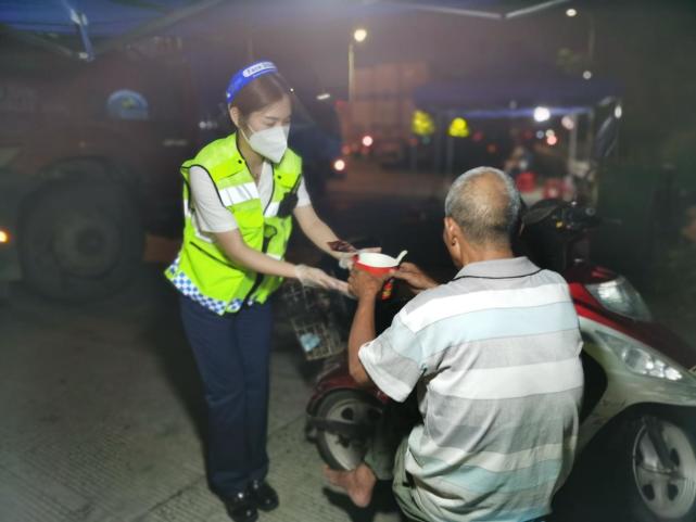 当时正值晚饭时间,邓晓雯担心老人体力不支,为其送上泡面和热水充饥,孔银团在一旁安抚老人的情绪:“没事的,您不用担心,等会儿民警会过来帮助您回家。”