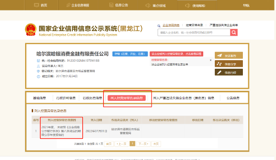 7月12日,黑龙江省市场监督管理局网站披露,哈尔滨哈银消费金融有限责任公司被列入异常经营名录,原因是未依照《企业信息公示暂行条例》第八条规定的期限公示年度报告。