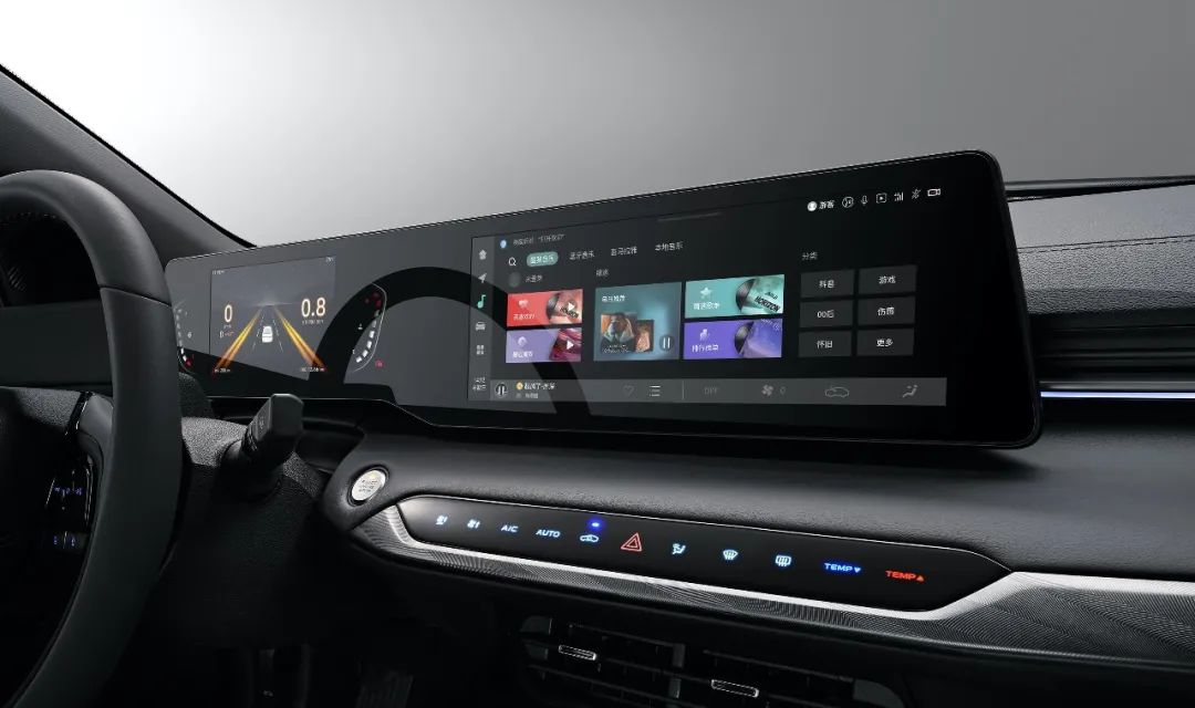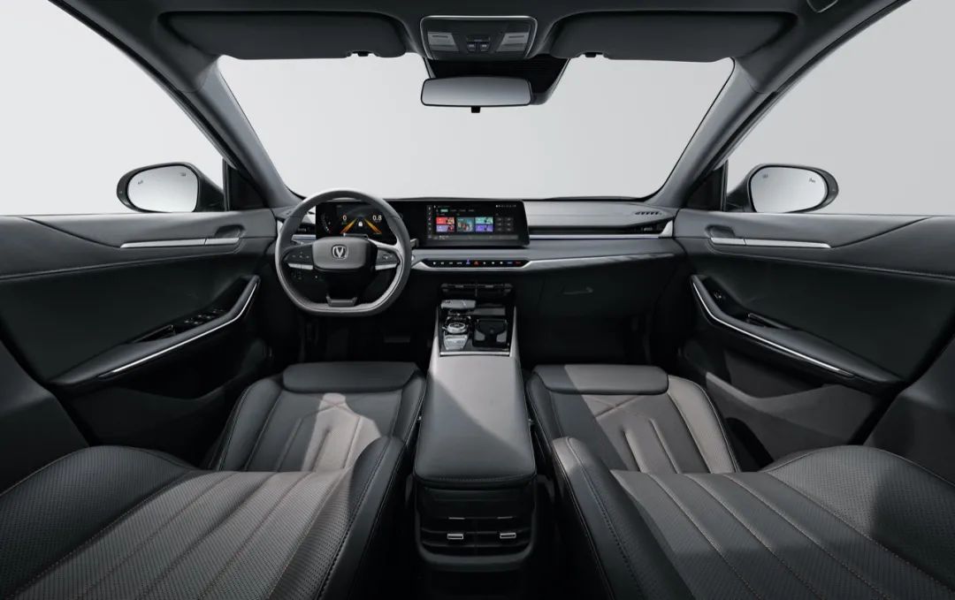 内饰方面,设计取形于“山水层叠”,取意于“古法水墨的意境”,并同时应用于色彩、纹理和内饰形态。新车中控台造型十分简洁,采用了悬浮双联屏式设计,是时下较为流行的内饰样式。