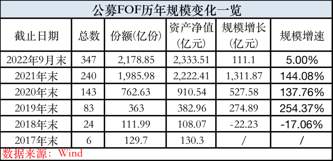 Wind数据显示,今年6月底财报数据加上9月底前新发数据,国内已有近70家基金公司布局公募FOF,已成立的公募FOF基金只数达到347只,总规模突破2300亿元,无论是数量还是规模均创出历史新高,从发展速度上看,除了2018年规模曾短暂缩水之外,其余4年时间均保持正增长,特别是在2019-2021年三年时间里,FOF规模年均增速超过1.78倍,即使在今年疲弱的市场环境里,规模增长也达到5%。