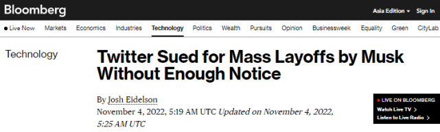 彭博社:推特因马斯克在没有充分通知的情况下大规模裁员而被起诉