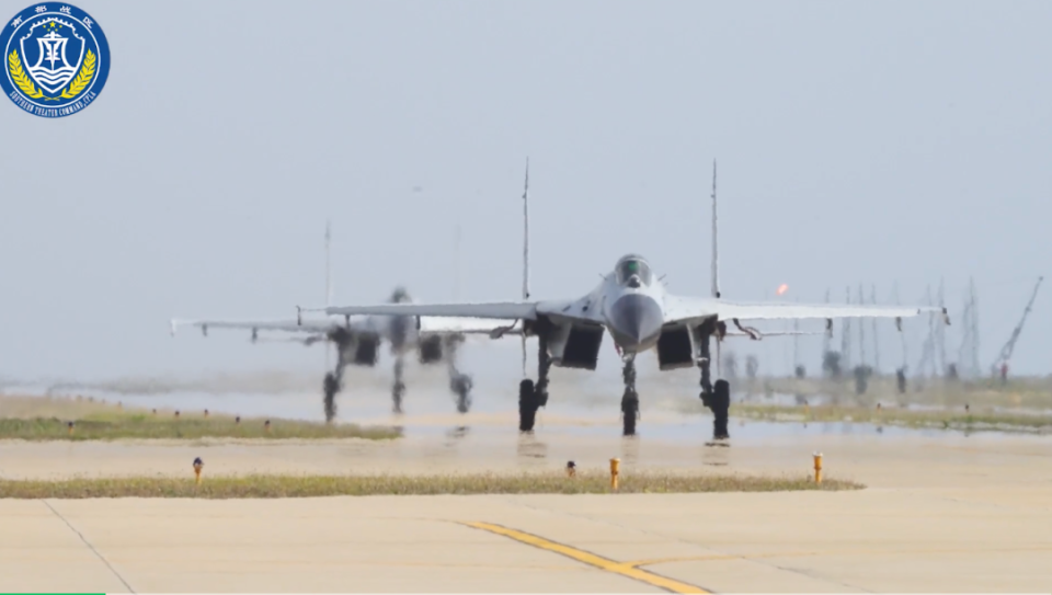 南部战区空军航空兵某旅飞行大队长卢赓作为带队长机,升空迎敌。