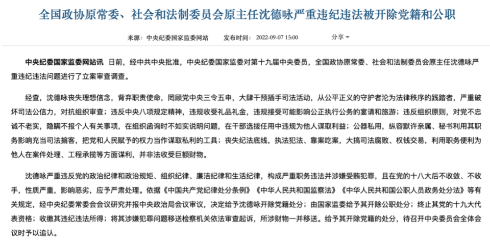 2022年9月7日,沈德咏被双开。中央纪委国家监委在通报中提到,沈德咏“公器私用,纵容默许亲属、秘书利用其职务影响充当司法掮客”。