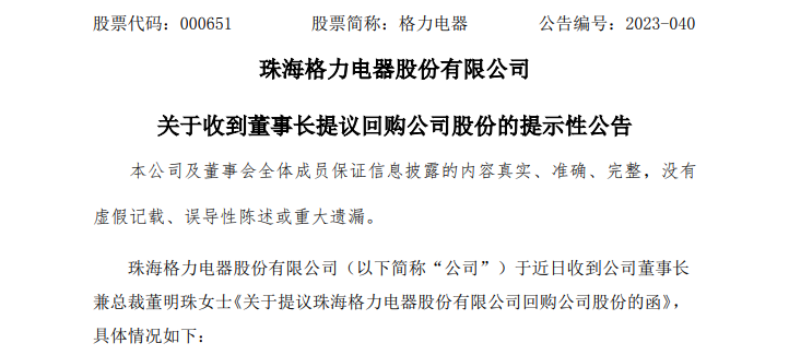 公告还披露,董明珠在本次提议前六个月内不存在买卖公司股份的情况,在本次回购期间暂无增减持公司股份的计划。此外,董明珠将积极推动公司董事会尽快审议回购股份事项,并将对本次回购股份事项投赞成票。