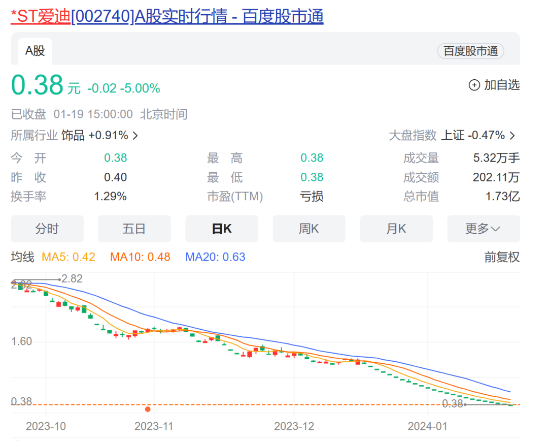 1月19日,*ST爱迪(002740)再度跌停,收于0.38元/股,自此,公司已连续20个交易日股价低于1元,触发面值退市。