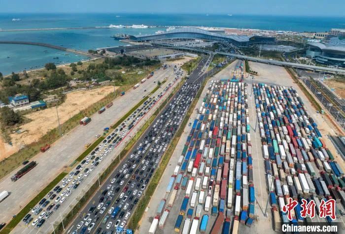 △海口新海港,大批车辆排队等待渡海