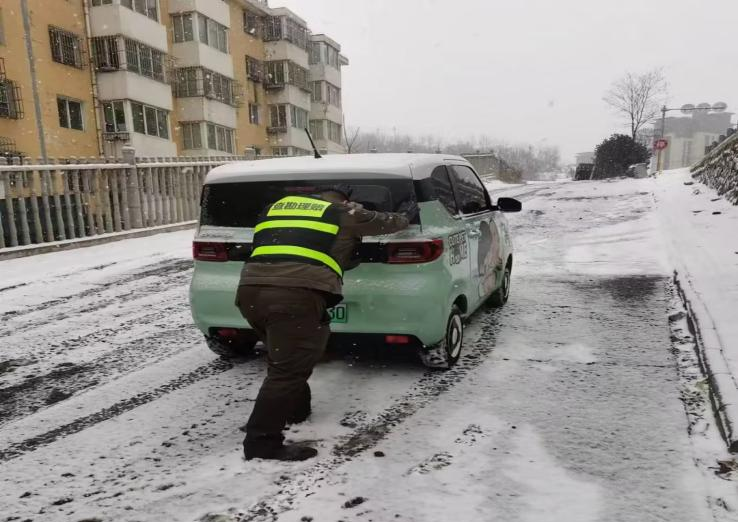 在山东菏泽,阳光财险菏泽中支两名员工午休时,看到路边一车辆无法正常行驶,主动上前过去询问情况,并帮助司机铲雪除障,帮助车辆正常行驶。