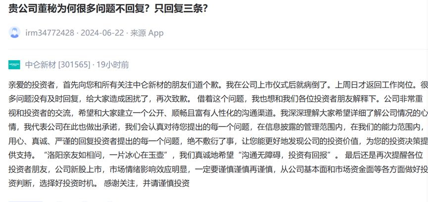 6月25日,C中仑新材董秘在投资者互动平台与投资者交流。对于投资者6月22日质问的“为何公司董秘很多问题不回复?只回复三条?”的问题,其表示,在公司上市仪式后就病倒了。上周日才返回工作岗位。很多问题没有及时回复。