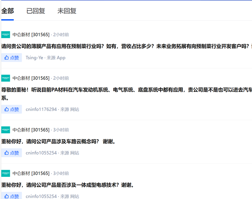 作为次新股,投资者与C中仑新材的互动较活跃。截至记者发稿,最近24个小时内投资者提问超过20条。而从回到岗位的三天时间里,这位董秘日均完成了接近20条互动易内容的回复。