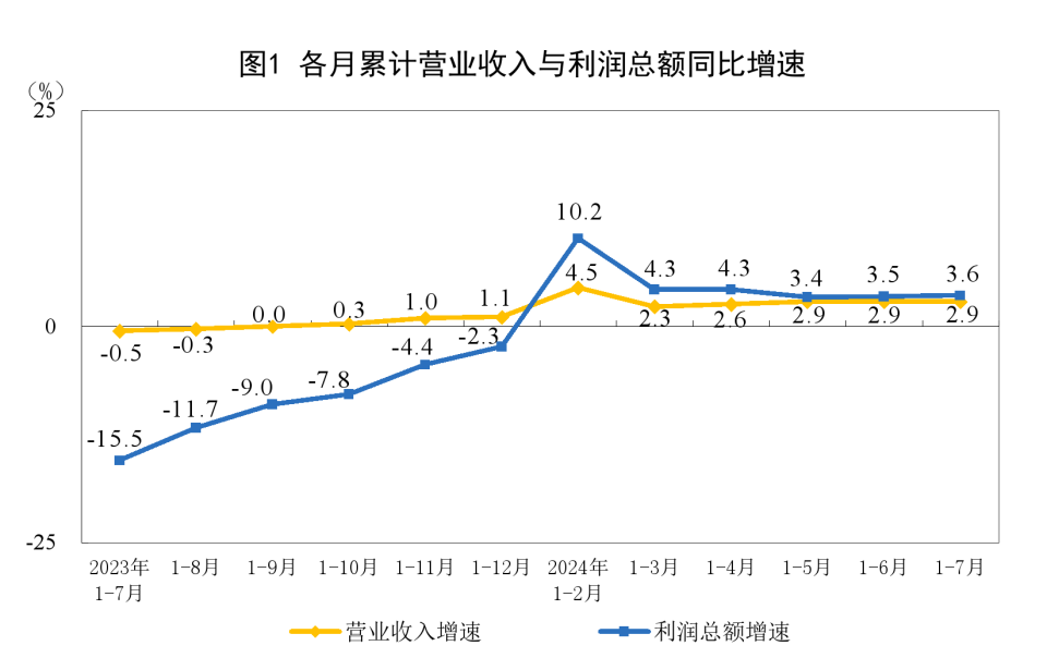 工业企业营收平稳增长。随着市场需求稳定恢复,产销衔接水平有所改善,工业企业营收平稳增长。1—7月份,规上工业企业营业收入同比增长2.9%,增速与1—6月份持平。企业营收稳定增长,为利润持续恢复创造有利条件。