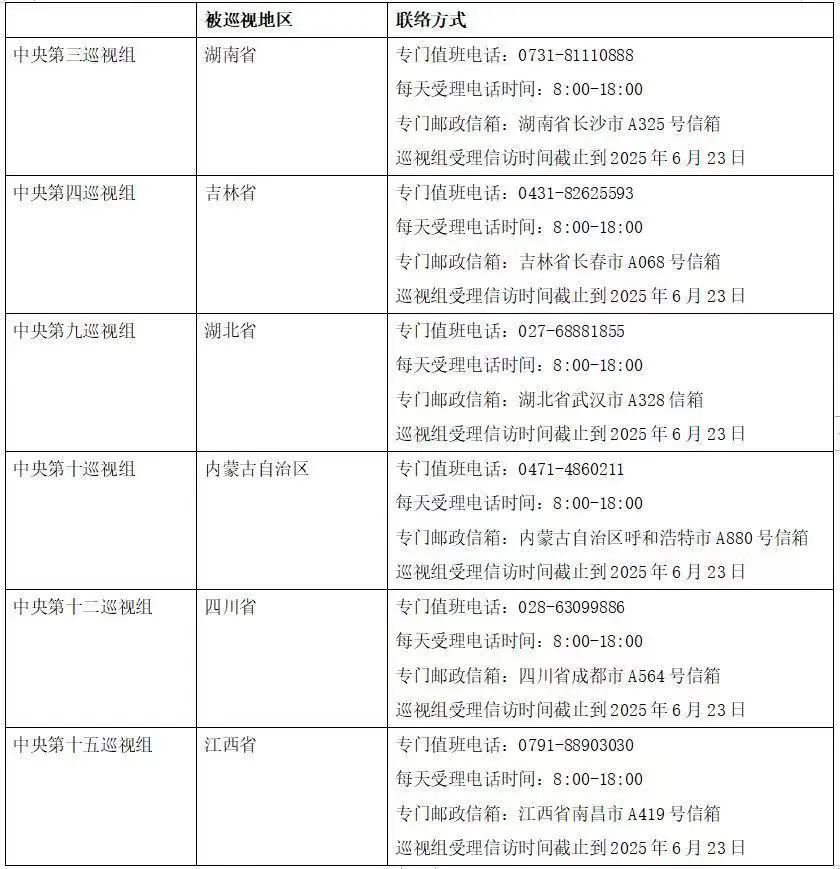 据披露,中央巡视组将在上述省份工作2个半月左右,巡视组受理信访时间截止到2025年6月23日。