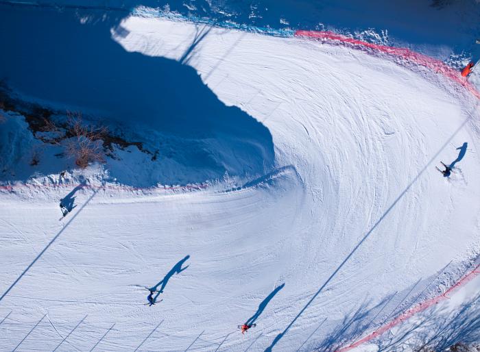 1月13日,在哈萨克斯坦阿拉木图的一处滑雪场,滑雪爱好者在滑雪(无人机照片)。