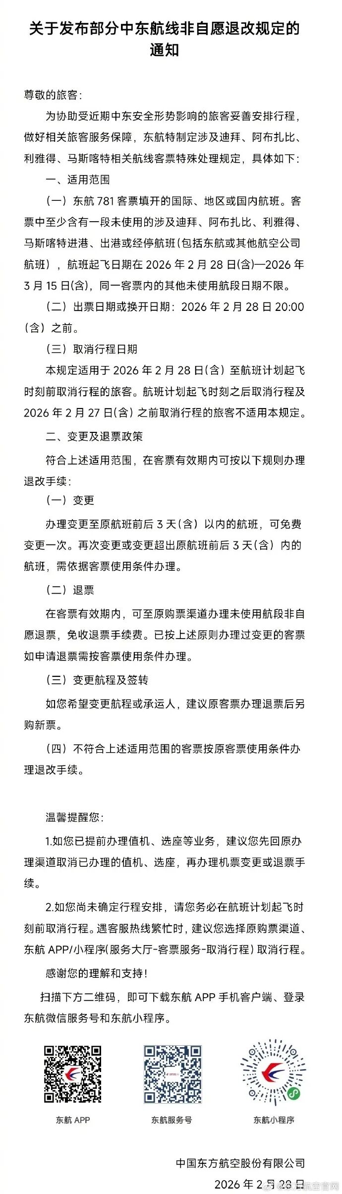 东航规定,旅客购买的机票至少含有一段未使用的涉及迪拜、阿布扎比、利雅得、马斯喀特的进港、出港或经停航班,航班起飞日期在2026年2月28日(含)至2026年3月15日(含),可免费变更一次至原航班前后3天(含)以内的航班。
