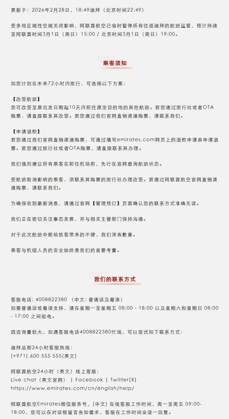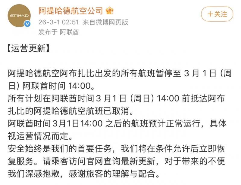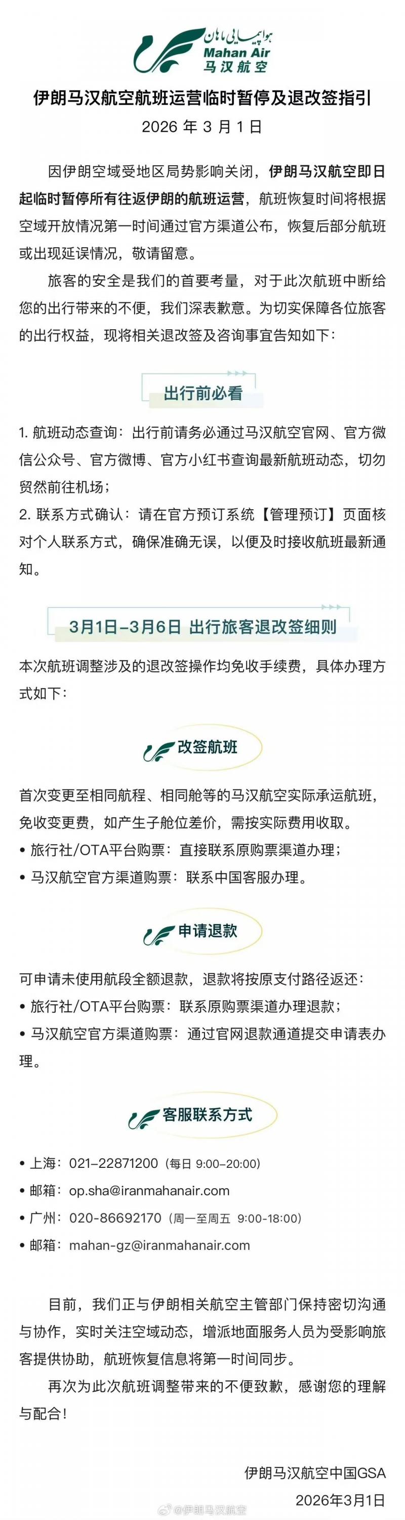 阿联酋航空、卡塔尔航空、阿提哈德航空、马汉航空等中东航司也已经宣布停飞对应枢纽航班,并发布退改指引,提醒旅客出行前查询航班动态。