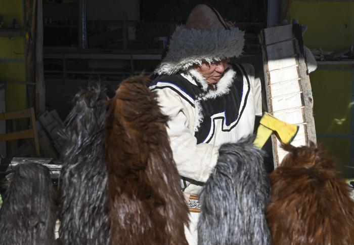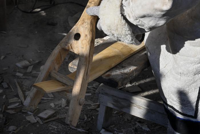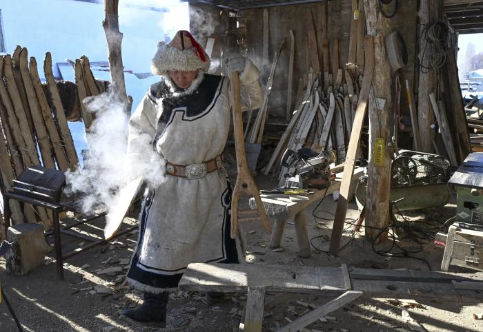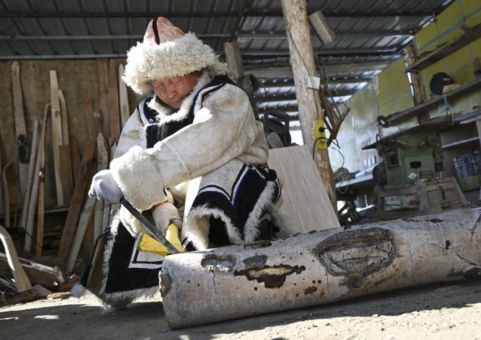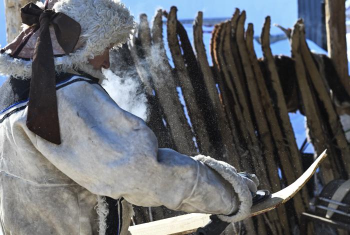 同样生长在这个村的巴图别勒克·吾齐克,是国网新疆电力有限公司阿勒泰供电公司汗德尕特乡供电所的一名供电服务工,每次踏雪进山巡线,巴图别勒克都要背上自幼便熟悉的毛皮滑雪板。近年来,铁木尔加甫主动定制适配巡线的毛皮滑雪板,免费赠予汗德尕特乡供电所。在新疆阿勒泰市汗德尕特蒙古族乡汗德尕特村,铁木尔加甫·卡汗别力克在加工用来制作雪板的木材(2月25日摄)。