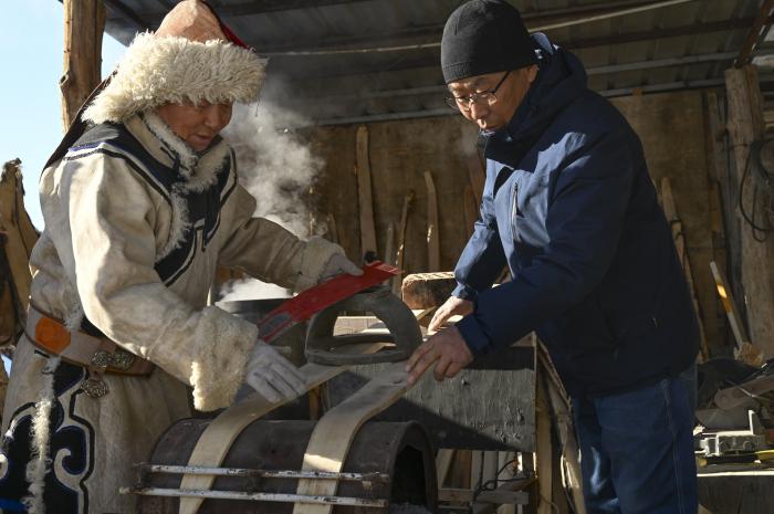 从文旅舞台到民生一线,毛皮滑雪板的跨界新生,是非遗保护与现代生活相融相生的生动实践。手艺人坚守匠心、精益求精,让传统技艺不失本色;基层部门主动对接、场景复用,让文化遗产赋能发展。在新疆阿勒泰市汗德尕特蒙古族乡汗德尕特村,巴图别勒克·吾齐克(右)在协助铁木尔加甫·卡汗别力克制作雪板(2月25日摄)。