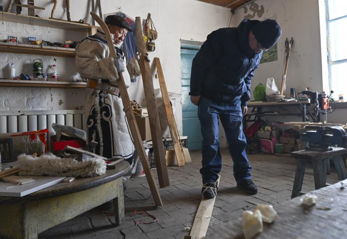 铁木尔加甫是毛皮滑雪板制作技艺家族第四代传人,从事这项手艺已五十余载。老匠人见证了毛皮滑雪板从牧民出行工具,到文旅文创产品,再到民生实用装备的三重蜕变。在新疆阿勒泰市汗德尕特蒙古族乡汗德尕特村,巴图别勒克·吾齐克(右)抱着铁木尔加甫·卡汗别力克为其定做的雪板(2月25日摄)。